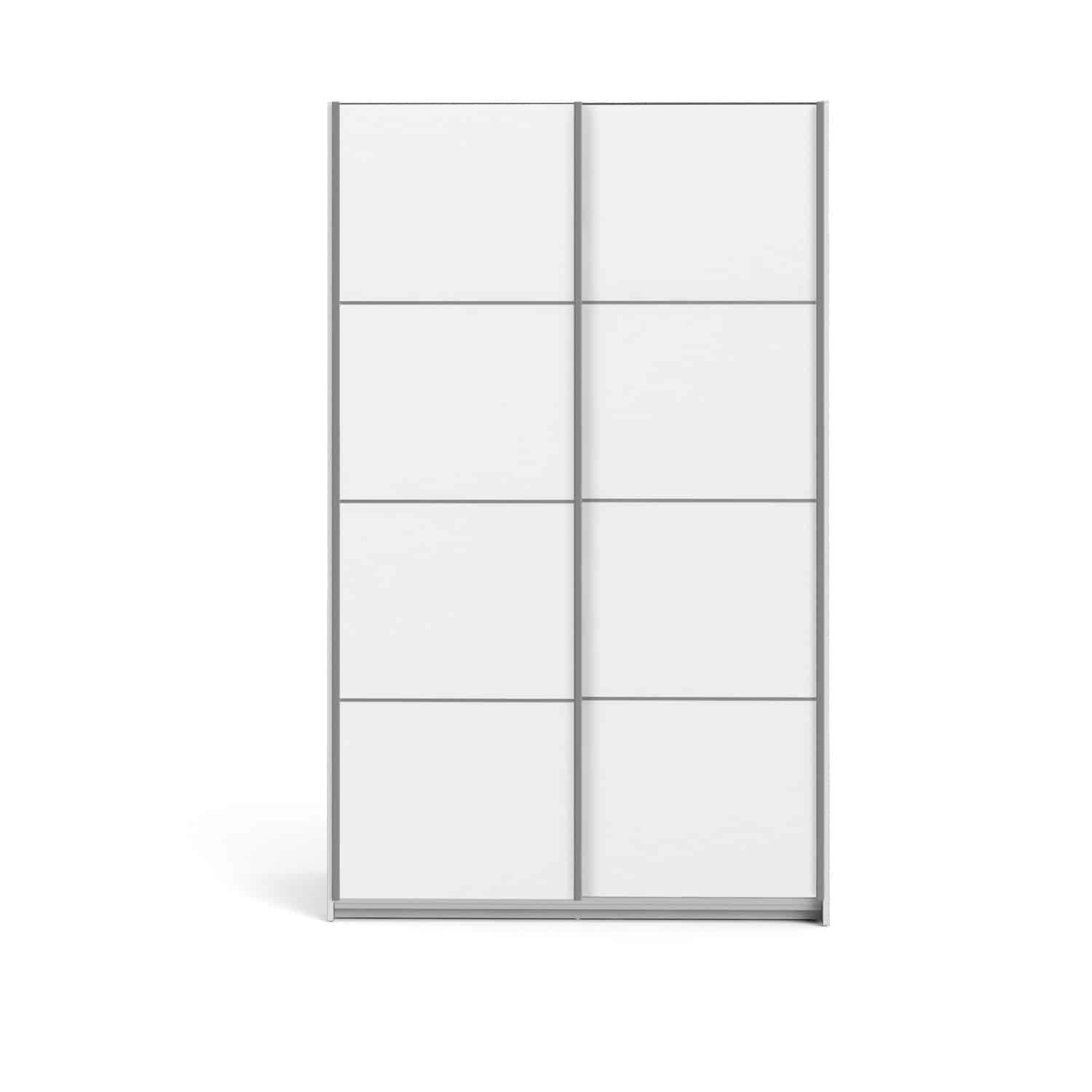 Moderne Verona-skydedørsskab i hvidt med rene linjer og to smalle skydedøre. Det hvide korpus giver lethed og en sammenhængende stil, der fungerer i stuer, værelser og entréer. Det tidløse design gør skabet alsidigt og passer ind i de fle